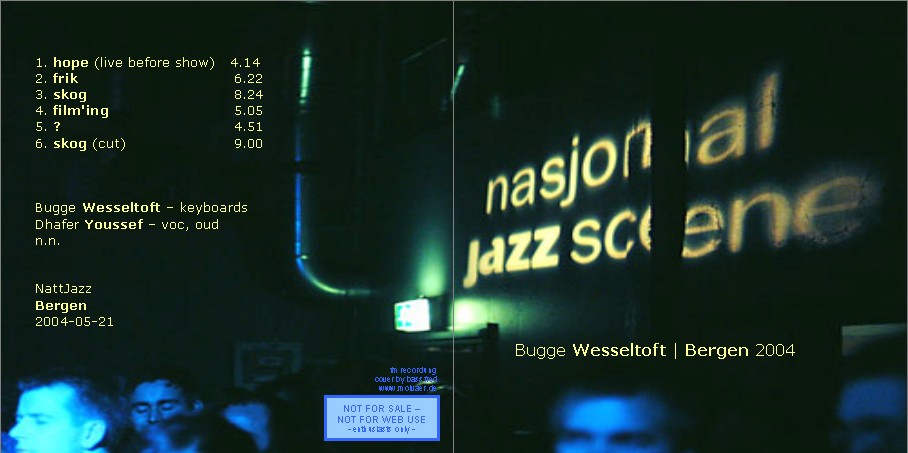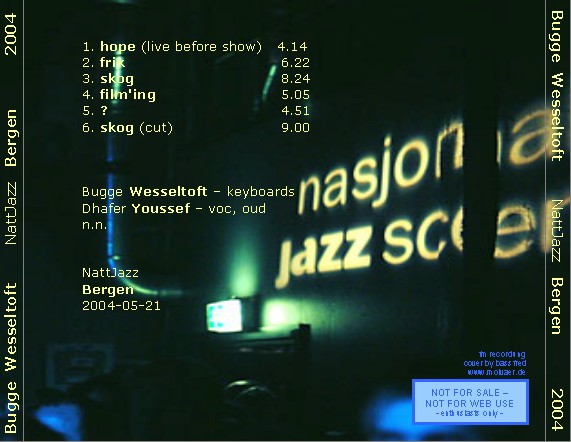 | 2004-05-21 | NOR | Bergen | Nattjazz (w/ Dhafer Youssef) | 5 | 0:30 | 1 cd | fm | A | LINK | LINK | |